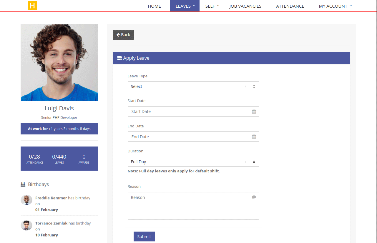 Applying for leaves is a cake walk with HRM. An Employee can apply for leaves on specific days or by using a date range when he wants to apply for a long leave - for example, sick or maternity leaves. Leave request is sent to the HR Manager for the approval. After approval or rejection, the employee is notified by an email.