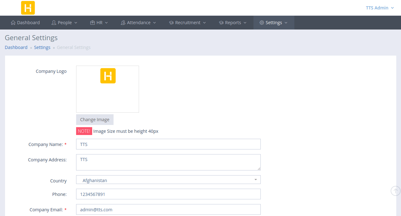 HRM provides many options to customize HRM according to your needs. You can change details like the logo, company address, contact number, email and currency to use on Settings Page.